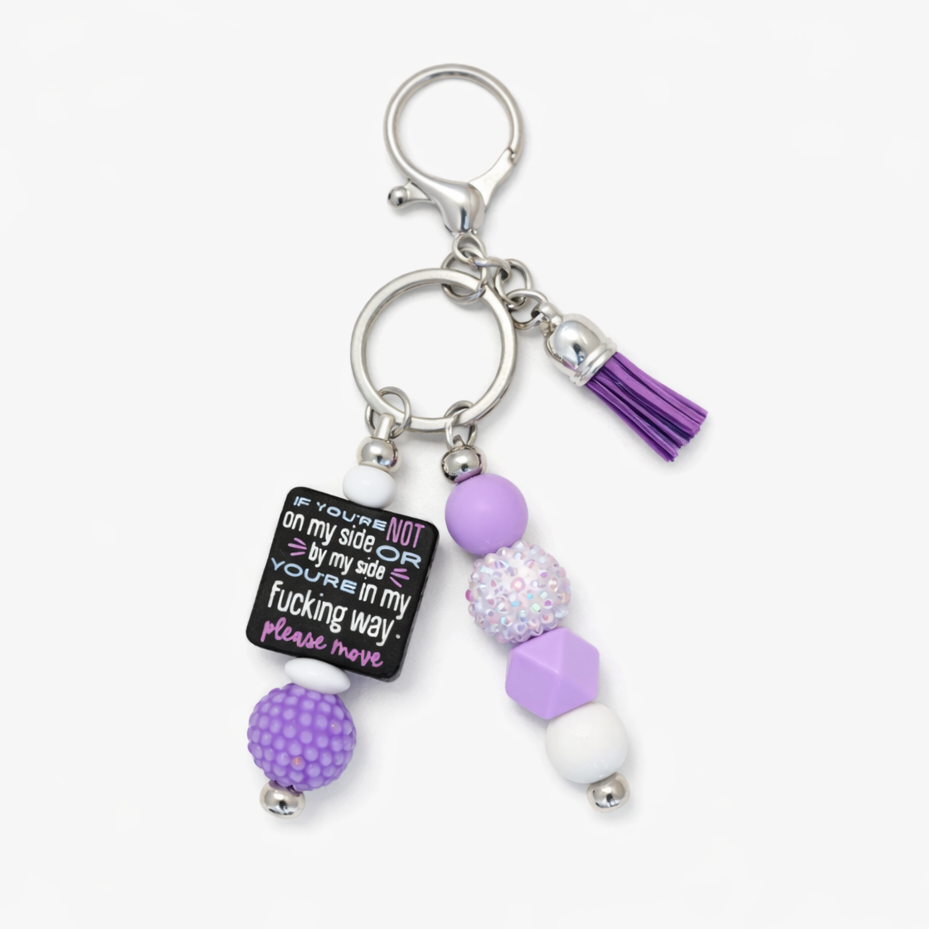 Make your message loud and clear — with style. This bold statement bag accent features playful purple tones, textured beads, a tassel detail, and a cheeky quote charm that brings humor and confidence to any bag.