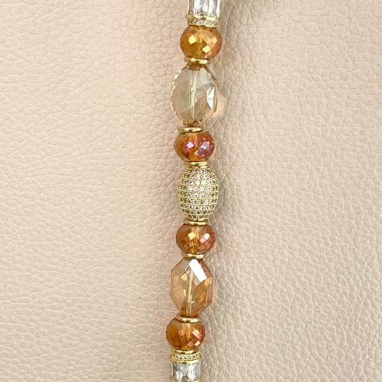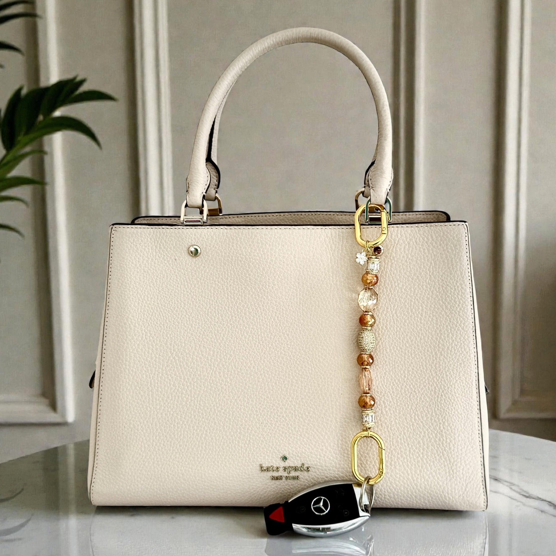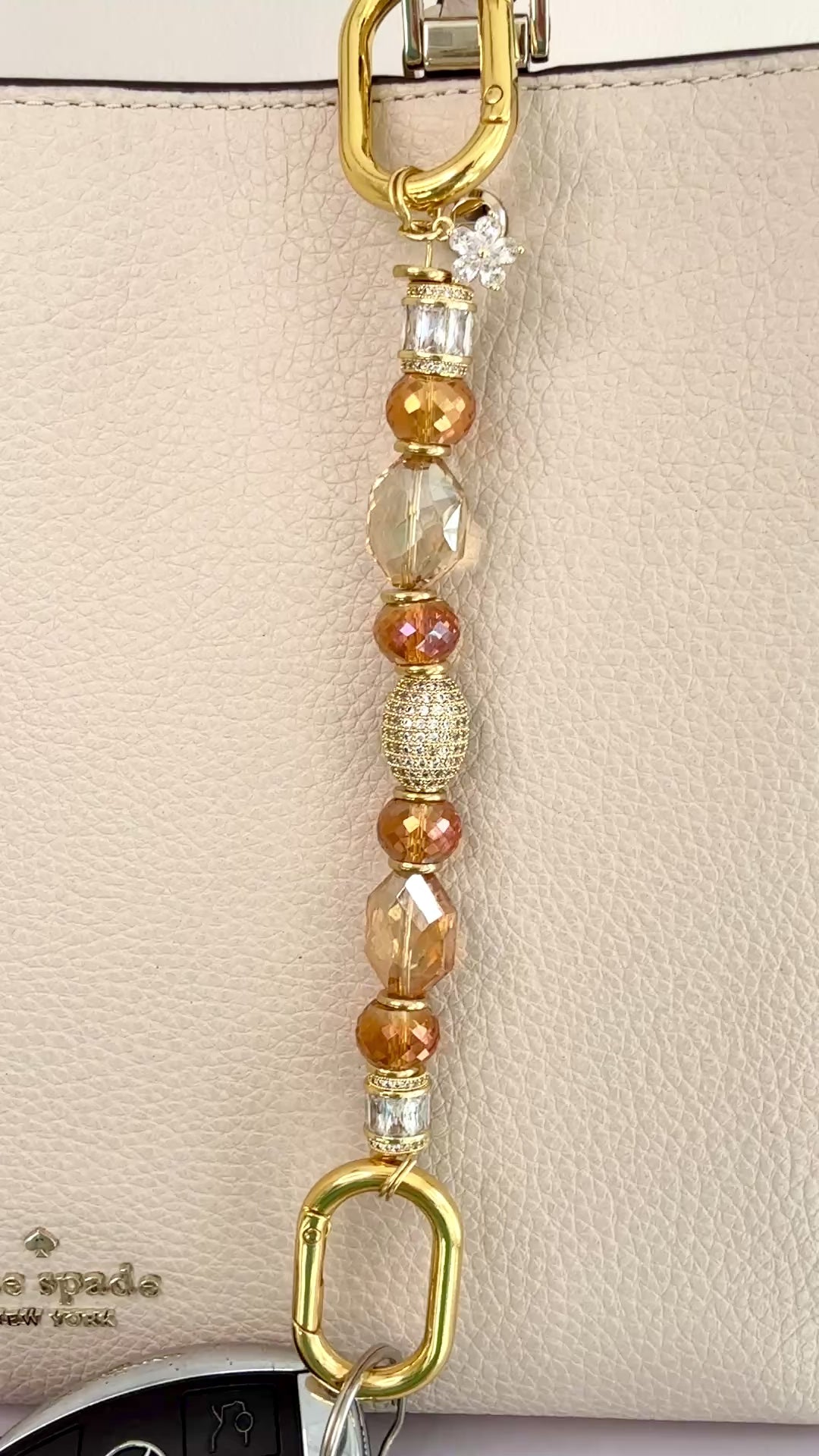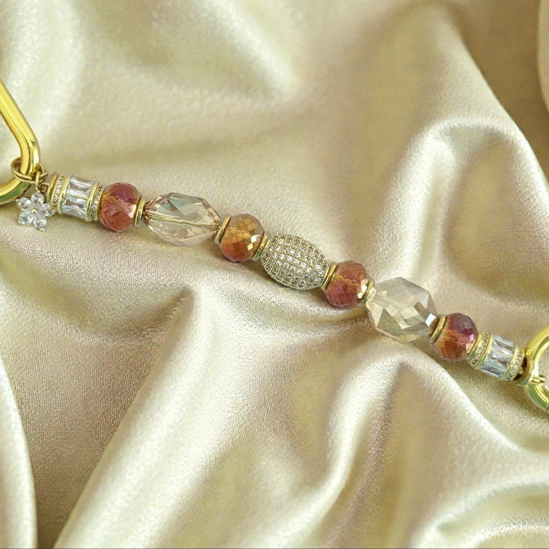Warm amber and champagne crystals, polished gold accents, and a delicate pavé flower charm come together in an elevated Key Companion designed to clip effortlessly onto your bag.