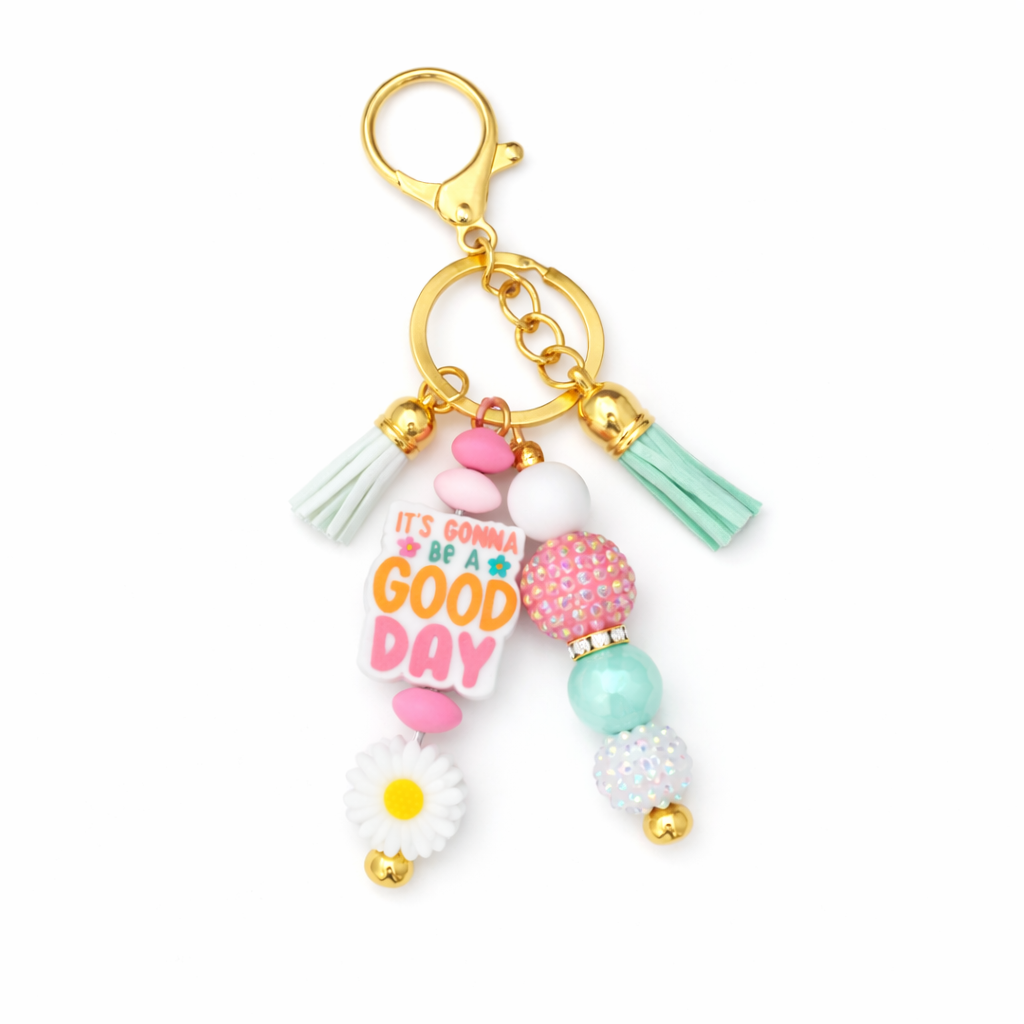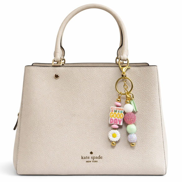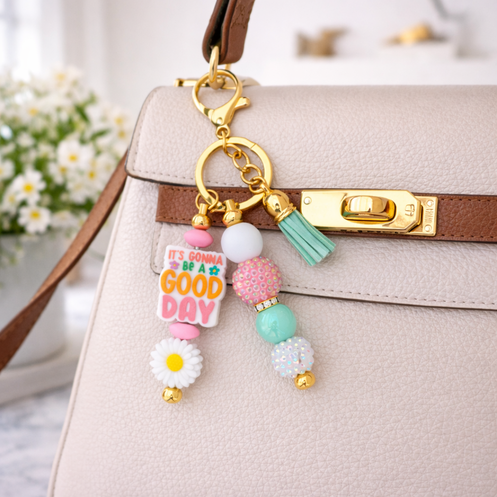 Start your day on a positive note with this cheerful It’s Gonna Be a Good Day bag accent. Featuring a bright message charm, a sweet daisy detail, and a playful mix of pink, mint, and white beads, this piece is designed to add instant happiness to any bag.